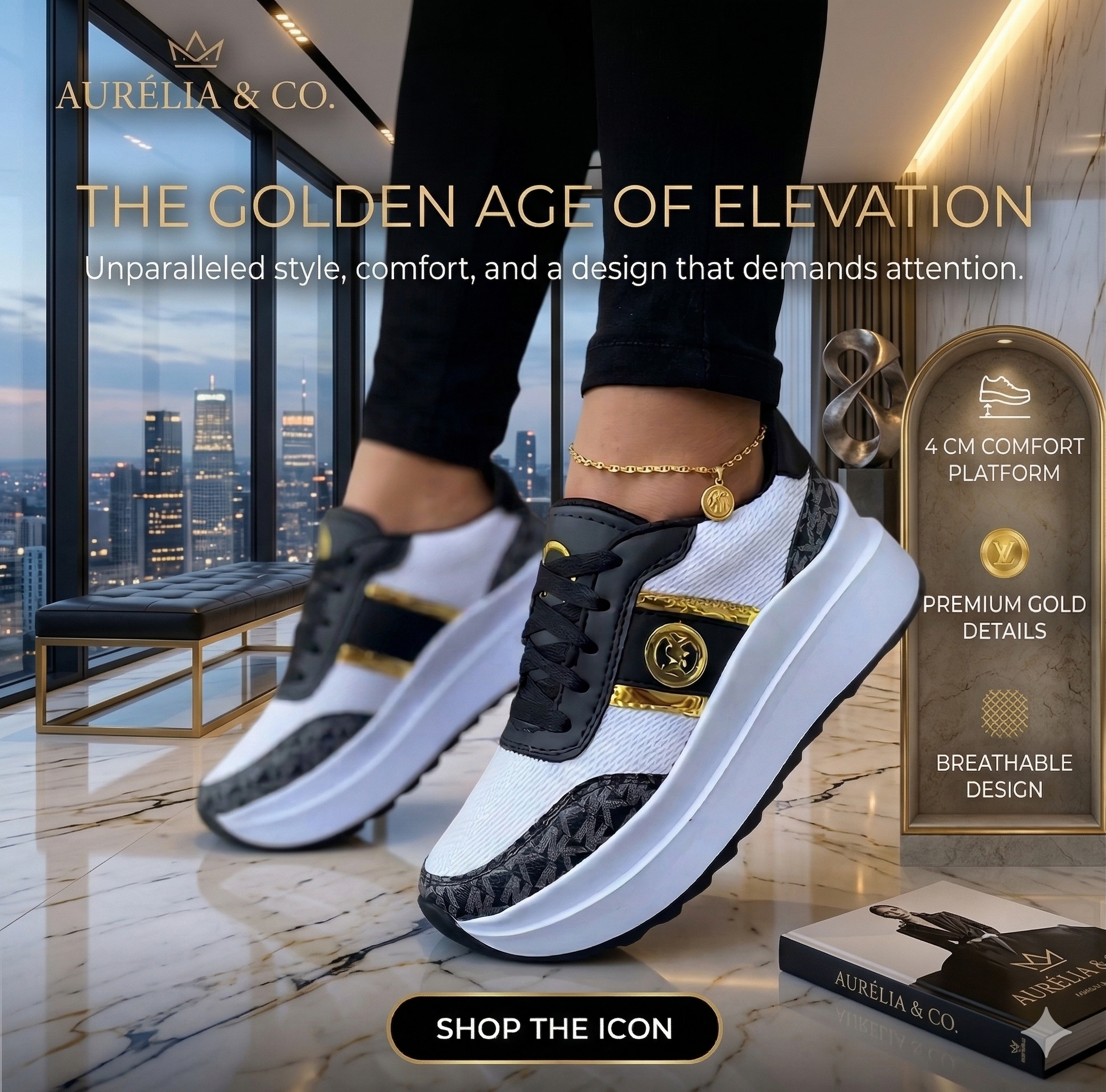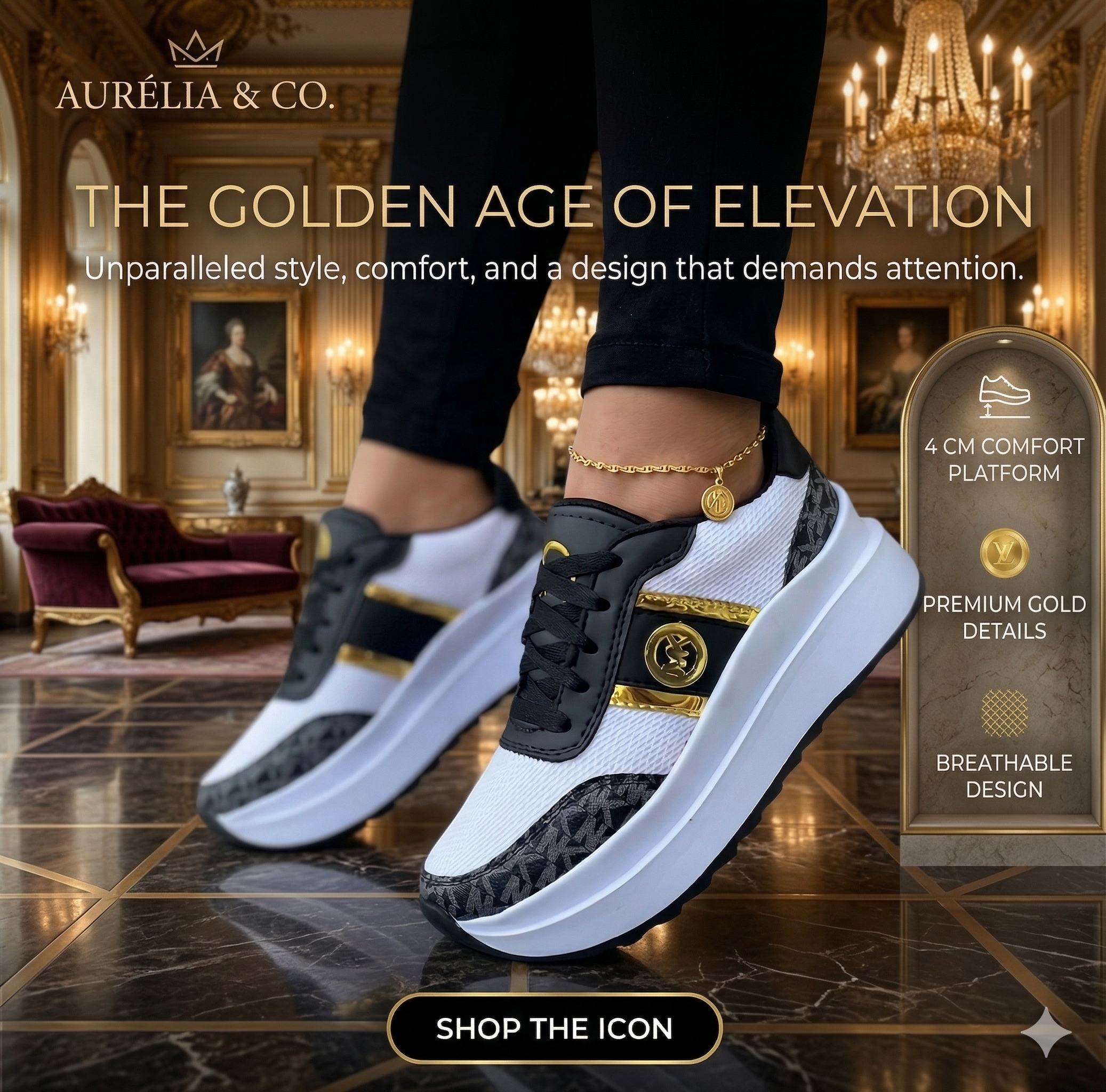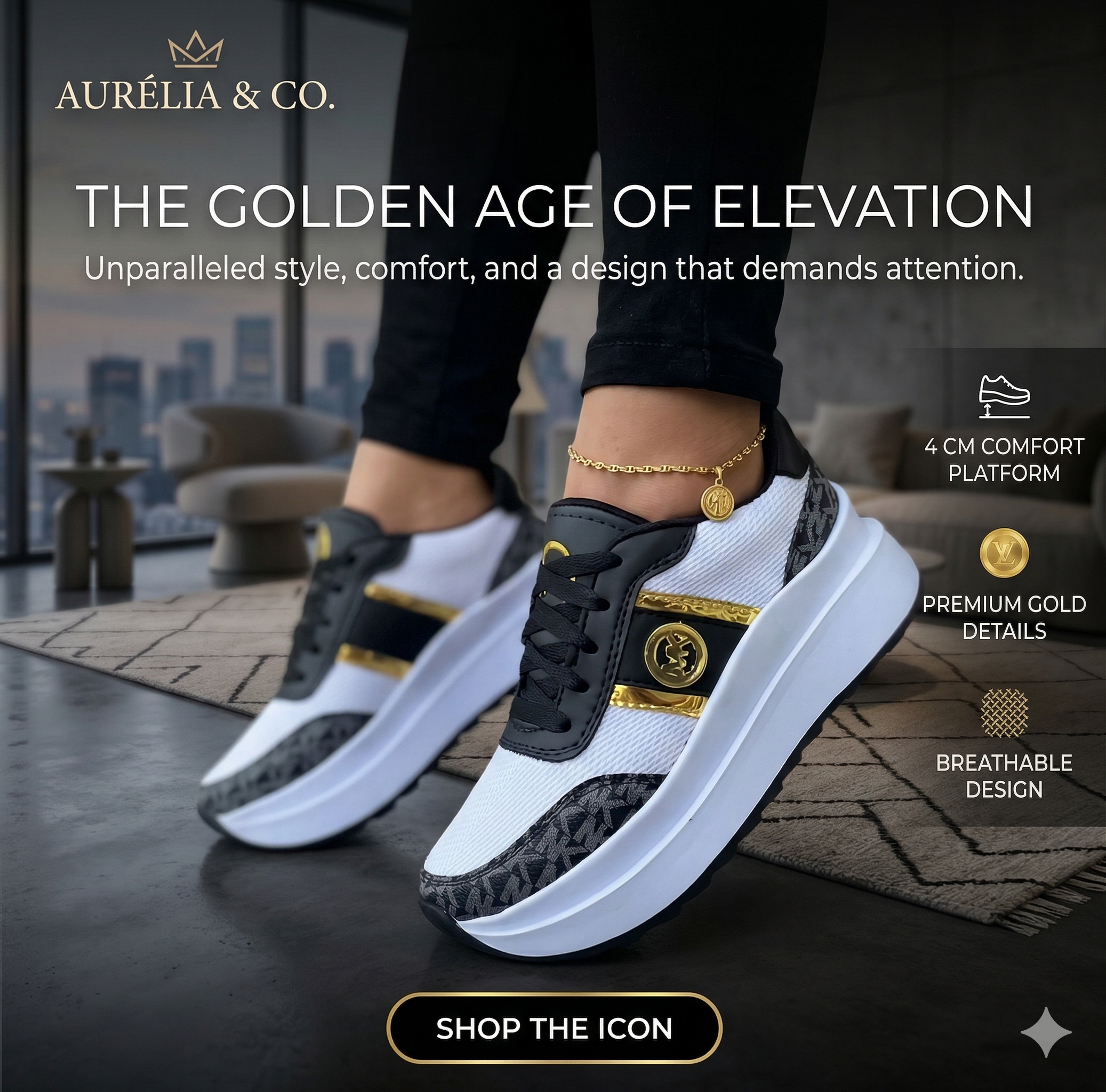 Turn heads wherever you go with these trendy kicks featuring a sleek design, bold gold accents π, and stylish patterned details. The elevated sole gives you that extra height boost π while keeping you super comfortable all day